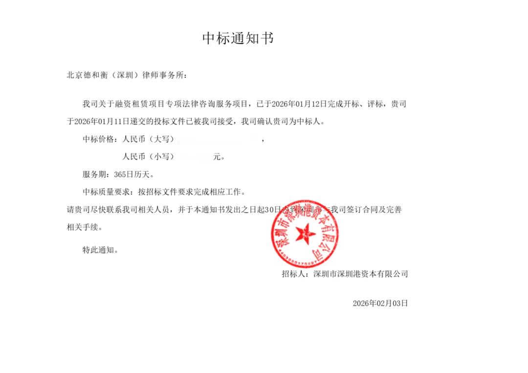 此次中标,既是对德和衡(深圳)专业能力与服务水平的高度认可,也是律所深耕融资租赁、保理等金融相关垂直细分领域的重要成果。未来,德和衡(深圳)服务团队将继续贯彻“专业、专心、专才、专注”的服务理念,紧密围绕客户的业务发展需求,为客户提供更优质、高效的法律服务,为企业高质量发展注入专业法律力量。
