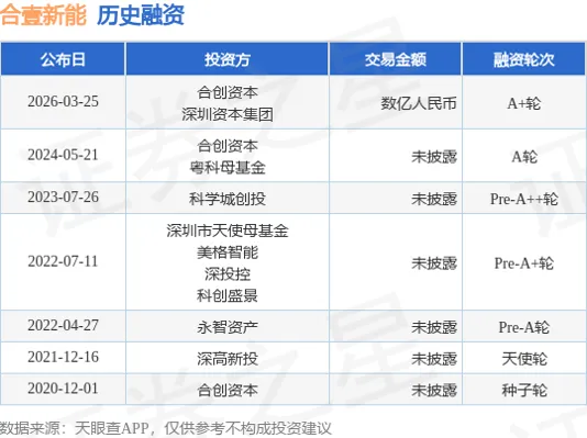 根据媒体3月25日公布报道,深圳市合壹新能技术有限公司最近完成A+轮融资,融资额数亿人民币,本轮融资由合创资本领投、深圳市属国有资本平台深圳资本集团跟投,融资资金将重点用于固态电池产线建设、核心团队扩充及全球运营布局。此前,公司已完成四轮融资,主要投资方包括深圳高新投、深圳天使母基金、美格智能、科学城创投、粤科金融集团等。
