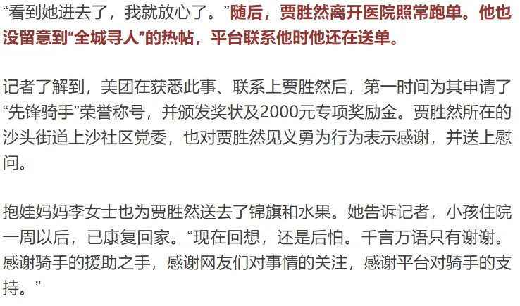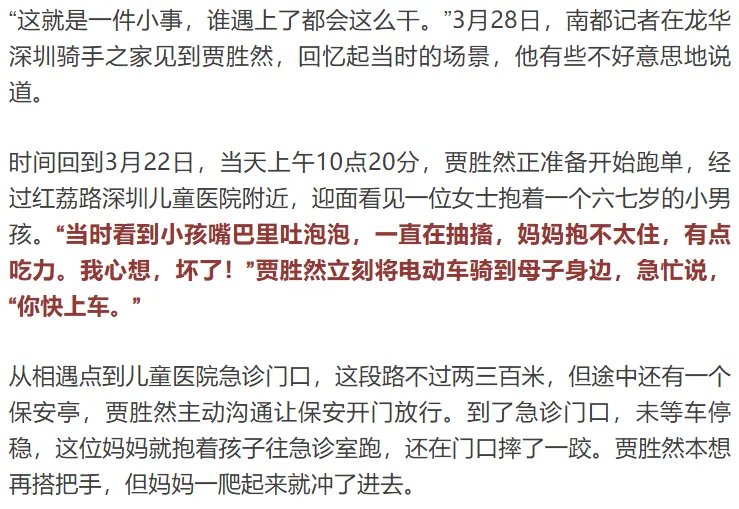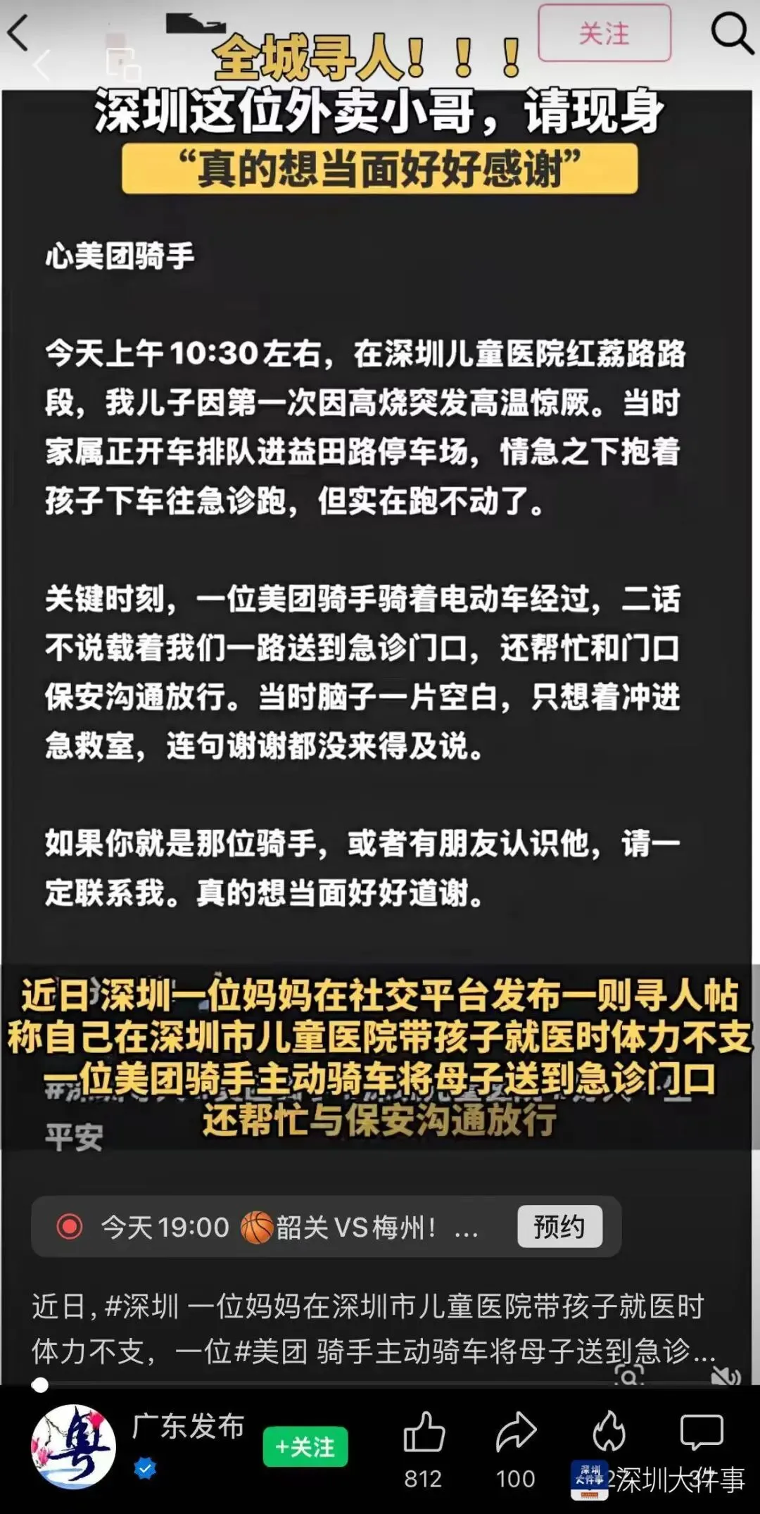 近日,一位深圳妈妈发布的全城寻找好心骑手的帖子刷屏——她抱着突发抽搐的孩子在儿童医院附近体力不支,一位骑手主动载着母子俩快速送到急诊门口。