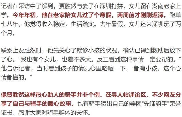不少网友接力寻人,也在评论区分享了在深圳与骑手之间的暖心故事。3月28日,这位骑手找到了!他叫贾胜然,1992年出生,湖南湘西人,在深圳跑单超过八年。