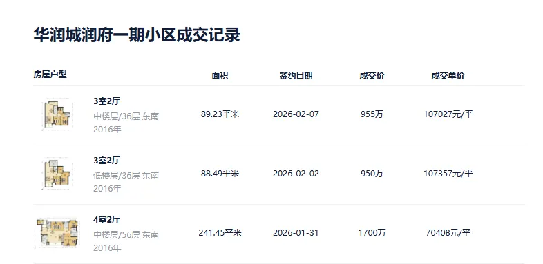 二手房市场上,华润城润府一期的交易活跃,价格也相对坚挺。不同户型和面积的房源价格有所差异,82 - 89 平米的两房至三房,市场售价普遍在 940 - 1300 万元区间;113 - 165 平米的三房至五房,价格则在 1400 - 2100 万元左右;而 200 - 241 平米的联排别墅,更是高达 2000 - 2700 万元 。这样的价格背后,是其无可比拟的地段优势、丰富优质的配套资源以及卓越的建筑品质和居住舒适度等多方面因素共同支撑的结果 。
