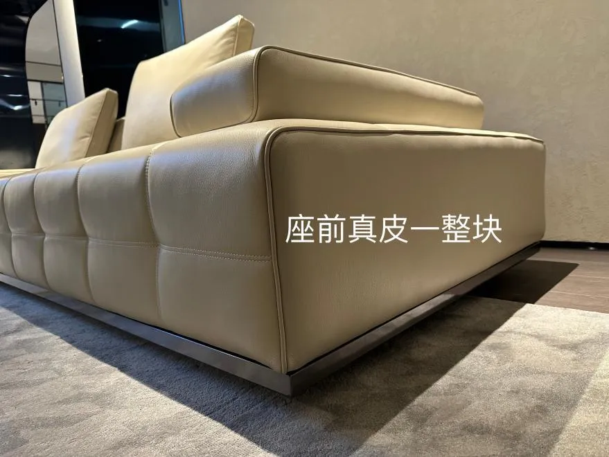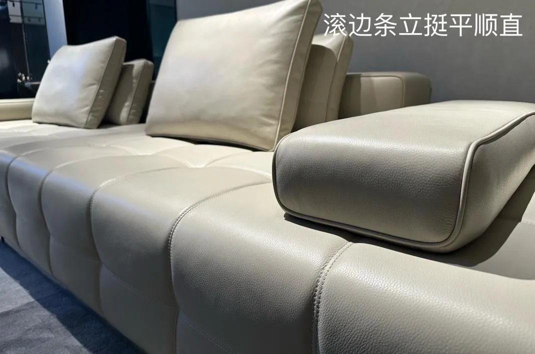 遵循意大利原版双线工艺,坐面采用大块皮料进行裁剪。此外,我们使用德国进口的杜克普衣车进行缝制,调针距为10mm三针,使用进口线,确保车线的精确性和稳定性。我们采用无骨白鹅绒,填充比例为3:7,使靠包和腰包填充饱满厚实,提供舒适的坐感和靠感。