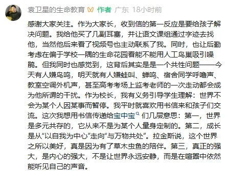 面对学生的请求,袁卫星没有简单粗暴地“一拆了之”或是“一键驳回”,而是以一封公开信,将“鸟鸣干扰”升华为一堂关于生命、共情与成长的哲学课。