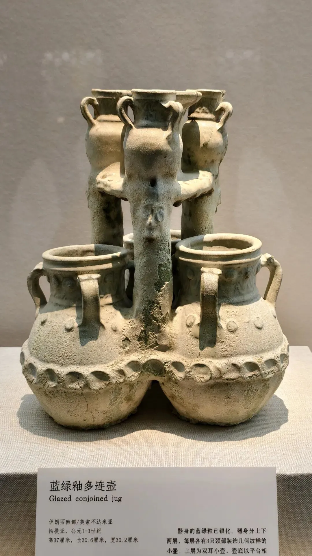- 多连壶:伊朗帕提亚时期的蓝绿釉多连壶,上下两层共6个小壶,以人形柱相连,工艺精巧,是文明交融的见证。