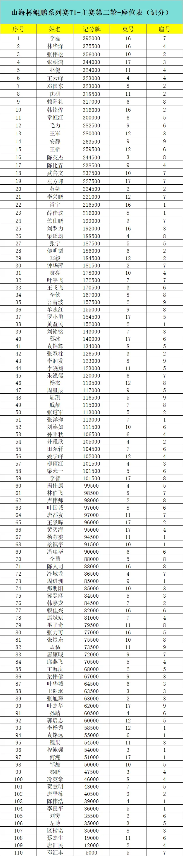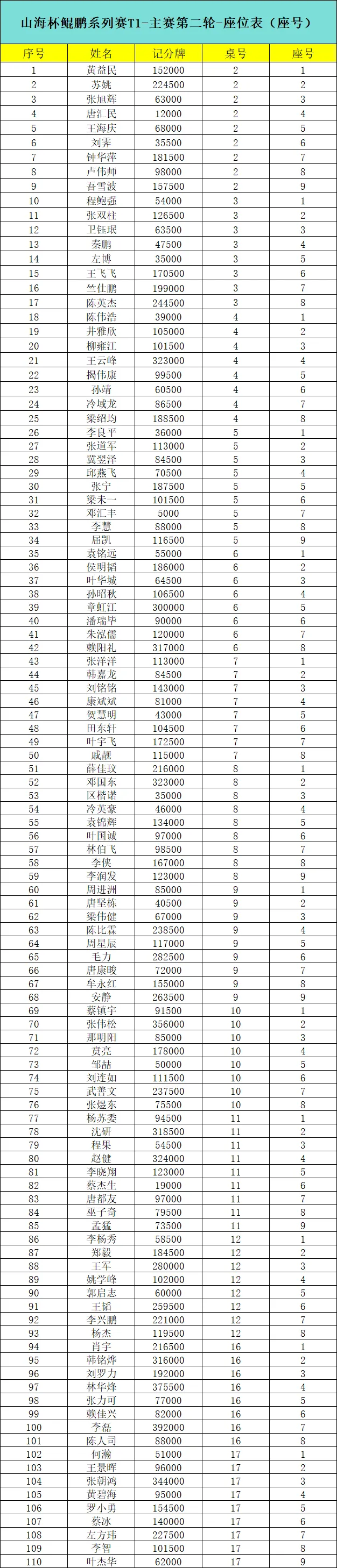 山海杯鲲鹏系列赛主赛第一轮赛况统计: