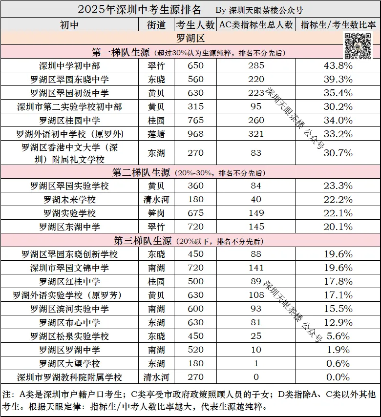 可以看出,罗湖区第一梯队生源有7所,AC类指标生/考生数超过30%。