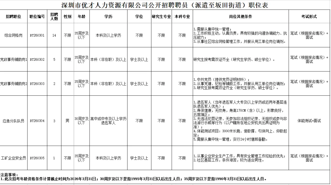 我司拟于近期面向社会公开招聘聘员25名,派遣至坂田街道办事处工作。现公告如下:(五)十八周岁以上,具备拟任岗位所要求的准入条件和其他资格条件,年龄时间计算截至2026年3月31日。(一)尚未解除党纪、政纪(行政)处分或正在接受纪律审查的,以及涉嫌违法犯罪正在接受司法审查尚未作出结论的;(二)曾因犯罪受过刑事处罚、被开除中国共产党党籍、被开除公职、被依法列为失信联合惩戒对象的;(三)被辞退未满五年的原机关事业单位工作人员(含公务员、职员、编外人员);(四)参加机关事业单位招聘被认定有考试作弊行为在限制报考期限内的;(五)现役军人,未完成教学大纲规定学习内容的结业生、肄业生;(七)法律、法规规定不得聘用为机关事业单位工作人员的其他情形。1.报名方式:现场报名,报考者须本人到场,不可委托他人代报名,每名考生限报1个岗位。现场报名地址:深圳市龙岗区龙城街道丰隆深港科技园5栋A座13楼。2.报名时间:2026年4月1日至2026年4月3日(工作日)9:30-11:30,14:30-17:30。(1)《深圳市龙岗区公开招聘聘员报名表》(附件2,报名表张贴近期1寸或2寸免冠彩照1张,承诺人处手写签名);(3)毕业证书及学位证书原件、复印件,教育部学历证书电子注册备案表、中国高等教育学位在线验证报告(登录“学信网”验证;毕业证书、学位证必须在报名时已持有),留学归国人员需提供教育部留学服务中心出具的《国外学历学位认证书》;(4)无犯罪记录证明(原件,由户籍所在地派出所或公安分局开具),如报名时无法提供可后补;(7)报考职位要求的其他材料(如退伍军人证、党员证明材料等)。4.报考人员请认真对照自身条件自行判断与招聘岗位要求是否相符,规范提供相关材料。个人材料提供不齐全或条件与招聘岗位要求不符,后续资格审查或招聘不通过,后果由考生本人承担。5.报考人员所留的联系电话、QQ、微信、电子邮箱、通讯地址必须真实准确,确保能够及时联系本人。因提供错误联系信息或未保持通讯畅通导致无法及时联系的,由报考人员本人承担后果。除无犯罪记录证明可后补,其他材料必须齐全,否则不予报名。6.报名期间同时进行资格初审,为保证现场报名工作顺利进行,报考人员需于报名当天刷本人身份证取号签到,未在规定报名时间(9:30-11:30,14:30-17:30)内取号的不再接收报名材料。证件材料不全且不能在报名期间的当天18:30前补全的或与报考资格条件不符的,初审不通过。建议所有报考人员尽早到达现场取号,预留足够时间进行报名。初审通过的考生方可参加后续考试流程。报名咨询电话:0755-89450163(工作日9:00-12:00,14:00-18:00)。党政事务辅助岗、综合网格岗、工矿企业安全员由笔试和面试组成。经资格初审,招聘岗位符合条件的报考人数未超过拟招聘人数5倍(含5倍),则采取直接面试的方式进行,无需进行笔试。招聘岗位报名人数超过5倍的,需先进行笔试,成绩合格线为60分。对笔试合格的考生,按照笔试成绩分数高低排序,根据拟招聘人数的5倍,确定入围面试人选,若笔试合格人数少于拟招聘的5倍,则所有笔试合格的考生均列为入围面试人选。应急分队队员由体能测试和面试组成。体能测试项目成绩合格线为60分,体能测试项目为3000米长跑、俯卧撑、引体向上、仰卧起坐。因岗位特殊性,报考人员均需参与体能测试,对体能测试合格的考生,按照体能测试成绩分数高低排序,根据拟招聘人数的5倍确定入围面试人选;若体能测试合格人数少于或等于拟招聘人数的5倍,则所有体能测试合格的考生均列为入围面试人选。进入面试的考生,由用工单位进行资格复审,资格复审不合格取消面试资格,并按分数高低进行递补。资格复审合格进入面试及后续程序。党政事务辅助岗、综合网格岗、工矿企业安全员面试成绩合格线为60分。对面试合格的考生,依总成绩(按笔试占40%、面试占60%合成考试总成绩)分数高低排序,按照拟招聘岗位人数1:1比例确定体检人选。总成绩相同的,面试成绩高的确定为体检人选;笔试、面试成绩均相同的,按面试主评委给分高低确定体检人选。应急分队队员面试成绩合格线为60分,对面试合格的考生,依总成绩(按体能测试占60%、面试占40%合成考试总成绩)分数高低排序,按照拟招聘岗位人数1:1比例确定体检人选。总成绩相同的,体能测试成绩高的确定为体检人选;体能测试、面试成绩均相同的,按面试主评委给分高低确定体检人选。同类型岗位可设置岗位备选人才库,准入条件应为总成绩合格,且岗位排名前50%(综合网格岗、工矿企业安全员、应急分队队员等岗位为80%)的未聘人员;自发布公告之日起一年内,如同岗位出现空缺,可在备选人才库中依次递补。总成绩及体检人员名单将于考试结束后,在龙岗政府在线(http://www.lg.gov.cn)、深圳市优才人力资源有限公司网站(http://www.szychr.cn)公布。由深圳市优才人力资源有限公司统一组织到指定的医院进行,体检费用由考生自理。体检合格者,纳入拟聘用人员予以公示。体检不合格者,不纳入拟聘用人员,所空出的名额按考试成绩排名先后依次审核递补。对体检合格的拟聘用人员,在龙岗政府在线(http://www.lg.gov.cn)、深圳市优才人力资源有限公司网站(http://www.szychr.cn)公示3个工作日。公示结束无异议并报区人力资源部门同意备案的人员,列入深圳市优才人力资源有限公司派遣管理,由深圳市优才人力资源有限