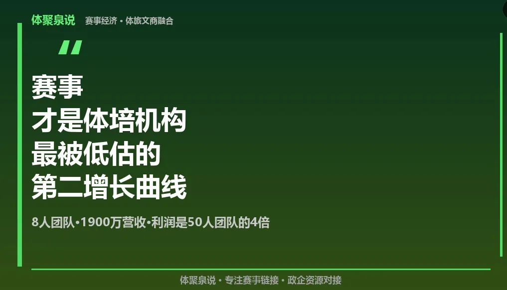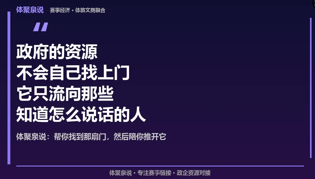 我们做的事,是在政府资源、文旅平台、赛事主办方、体培机构之间,找到那个能让各方都能赚的结构——然后把它撮合起来。