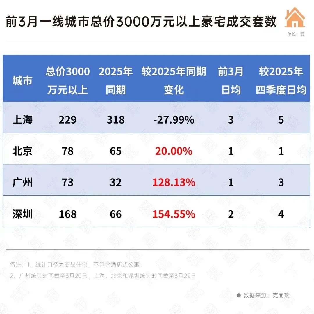 截至3月22日,一线城市亿元以上新房豪宅共成交25套,其中深圳占12套、广州占7套、上海6套。