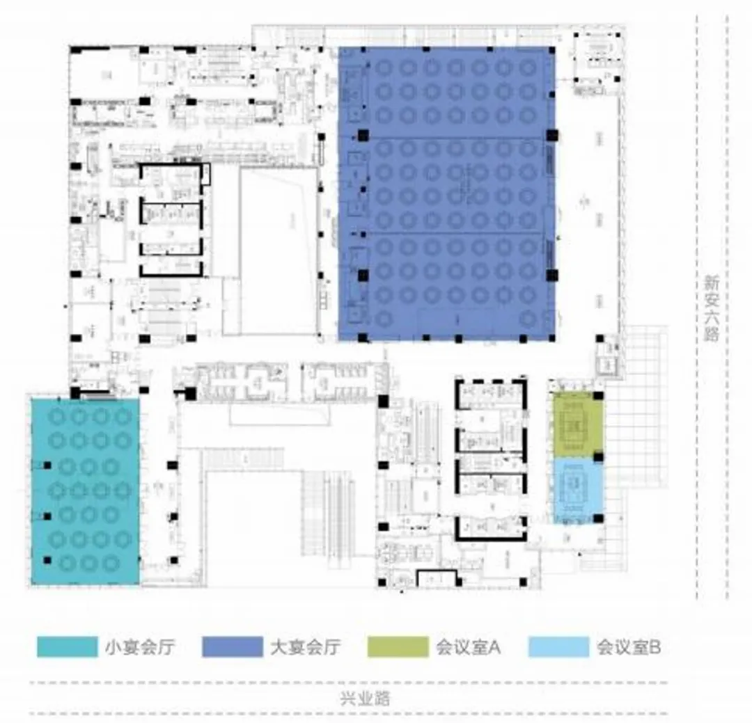 大宴会厅约1080㎡ ,小宴会厅约450㎡,会议室A