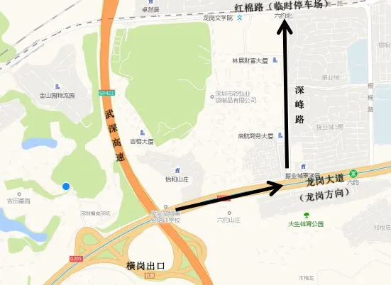 2.自市区出发路线:往龙岗大道龙岗方向行驶,在深峰路路口左转进入,经深峰路进入红棉路临时停车场,转乘接驳专线。