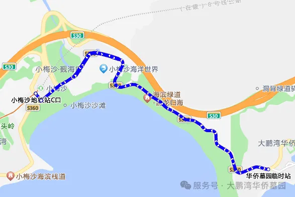 成功预约深圳大鹏湾华侨墓园祭扫的车辆,可从惠深沿海高速溪涌出口匝道下高速,沿盐葵路通行至华侨墓园内祭扫。