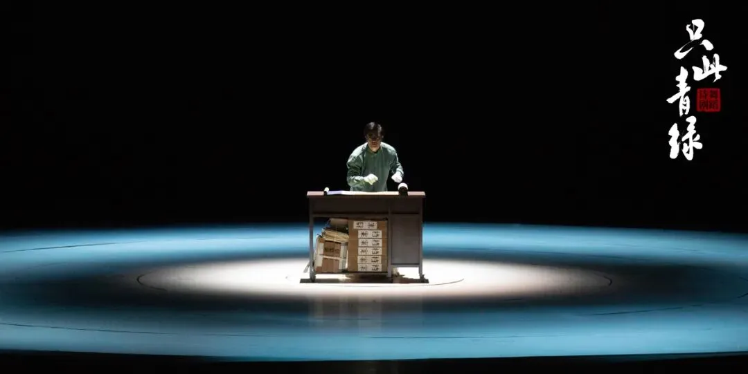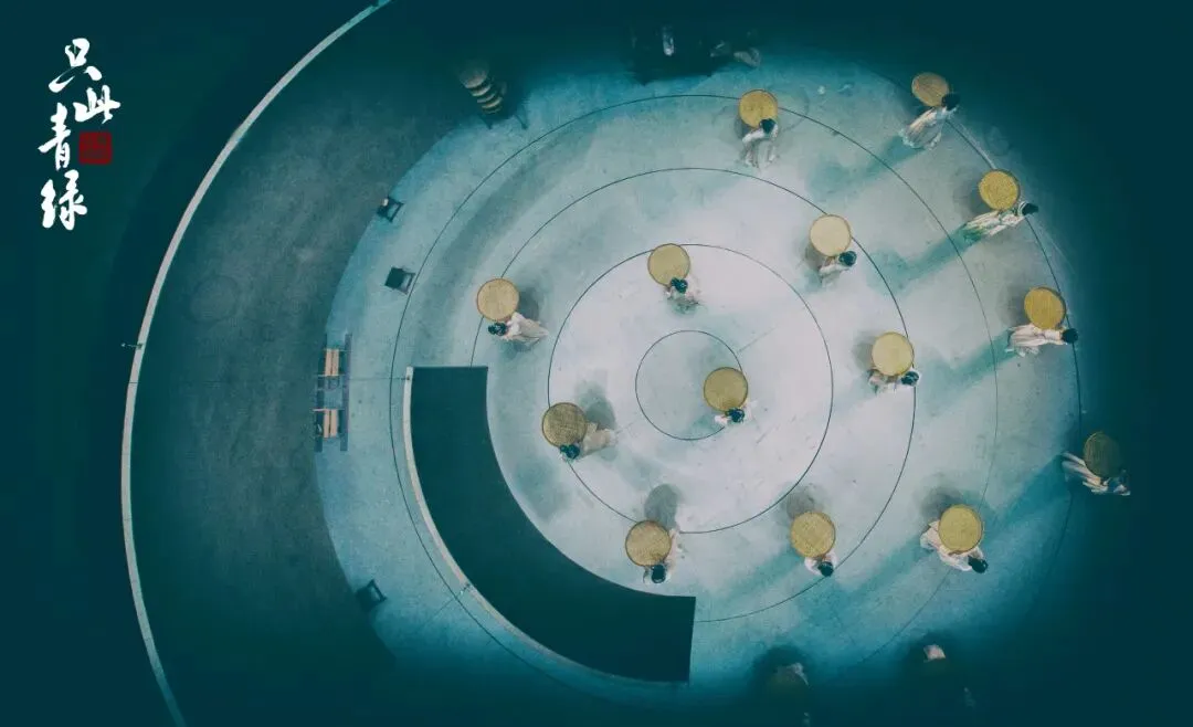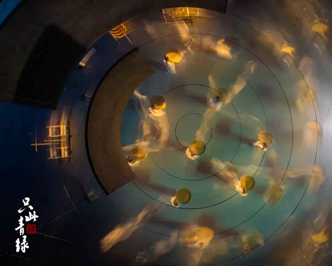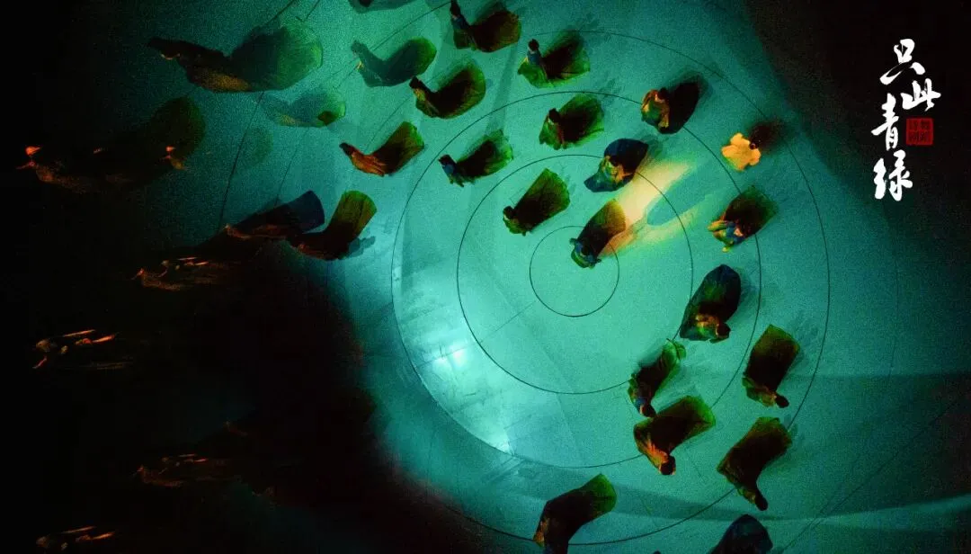 《只此青绿》的舞台,做了同心圆的巧妙设计,还原了中国传统画卷的“展卷”过程。画中,天地无边,山水无界,一切在行云流水间,悄然转化。