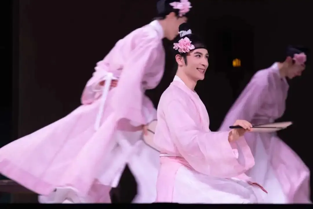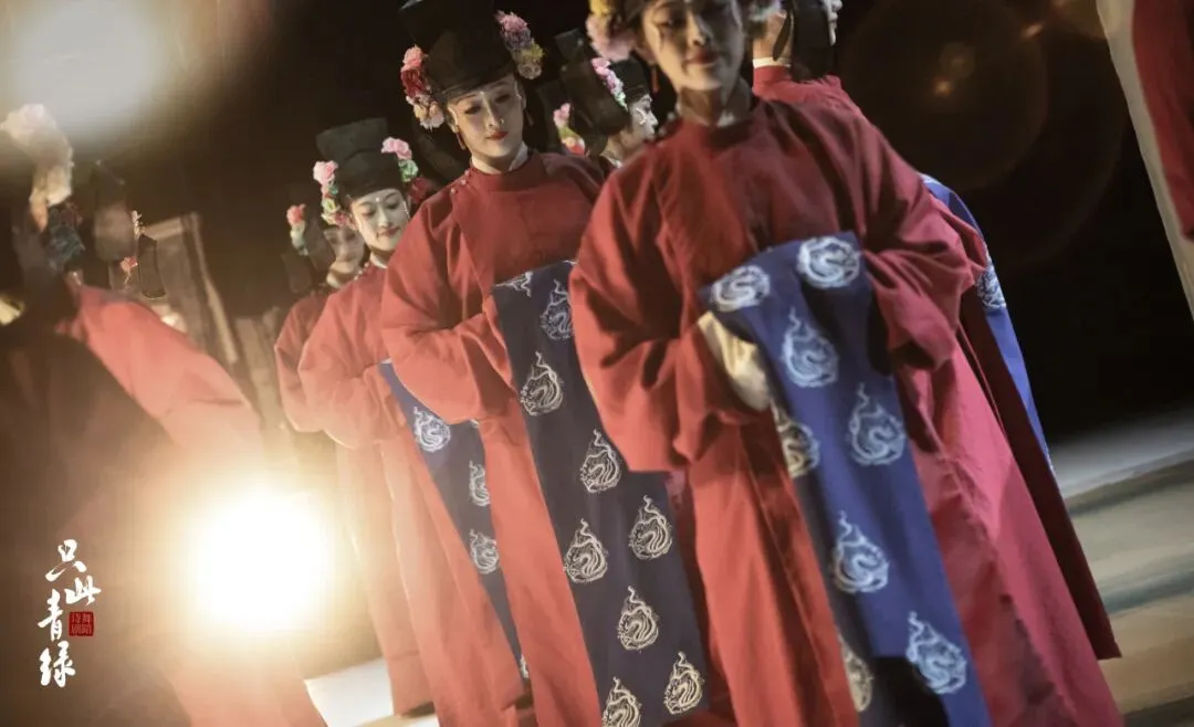 舞蹈诗剧《只此青绿》的服装,忠实地回溯了宋代美学的特征和服饰样式。强调留白气质、概括和简约,要在含蓄中展现出多彩多姿,要在裙袖间展露宋朝风采。从女官大体通红的圆领袍,到翰林书院淡粉的意气风发,再到《千里江山图》原画中,山石间的小白点、小白人,款式的统一、色彩的统一,潜移默化地营造着前所未有的大宋盛世。