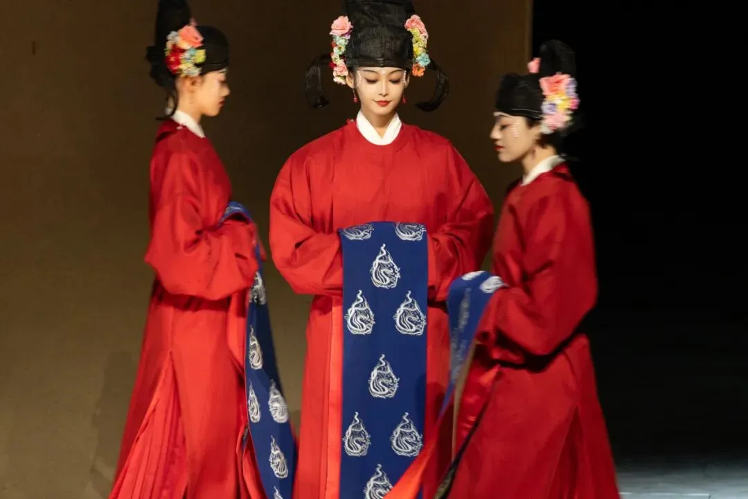 白色的丝绢,靛蓝色的篆刻,赭褐色的石,青灰色的笔,黑灰色的墨,再加上女官的大红官服、男子的粉衣簪花……各种迷人优雅的中国古典色彩,让人徜徉在具有鲜明流变性和浓郁文化气息的宋代美学和中国传统意趣之中。