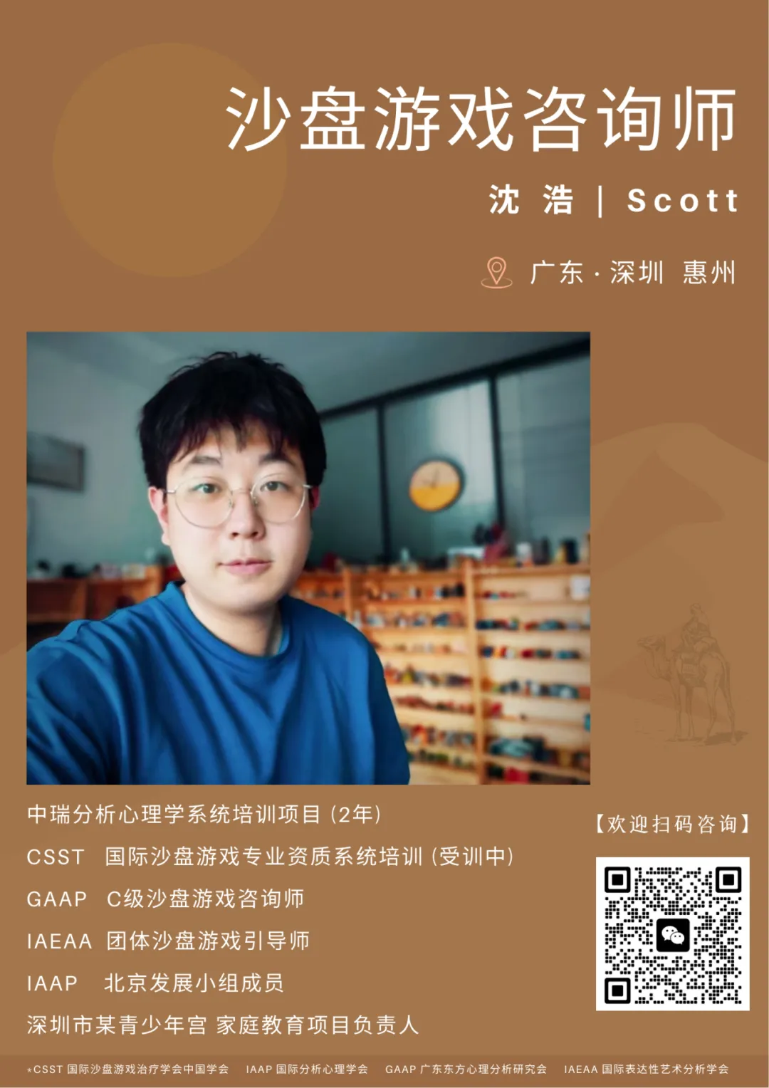 本人长期接受国际分析心理学会(IAAP)及中国分会(CSAP)和国际沙盘游戏治疗学会(ISST)及中国分会(CSST)教员和成员的教学、分析和督导,曾在深圳市康宁医院、南昌市南大二附院见习数月,先后在政府单位从事精神卫生、心理咨询和家庭教育工作。