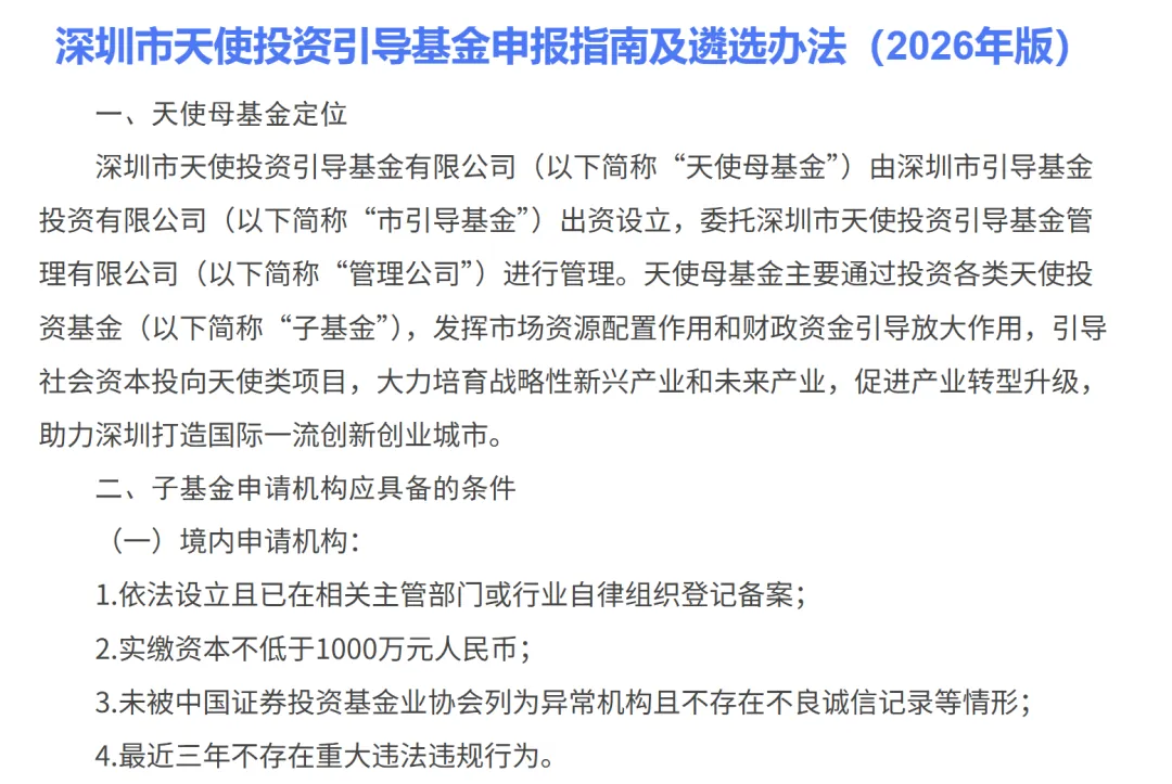 近日,深圳天使母基金正式发布施行《深圳市天使投资引导基金申报指南及遴选办法(2026年版)》(简称《办法2026》),引发创投圈广泛关注。新规全面放宽返投约束条件,取消基金管理人本地注册硬性要求,并建立循环投资机制,被业内视为2026年创投行业最具开创性的探索之一。