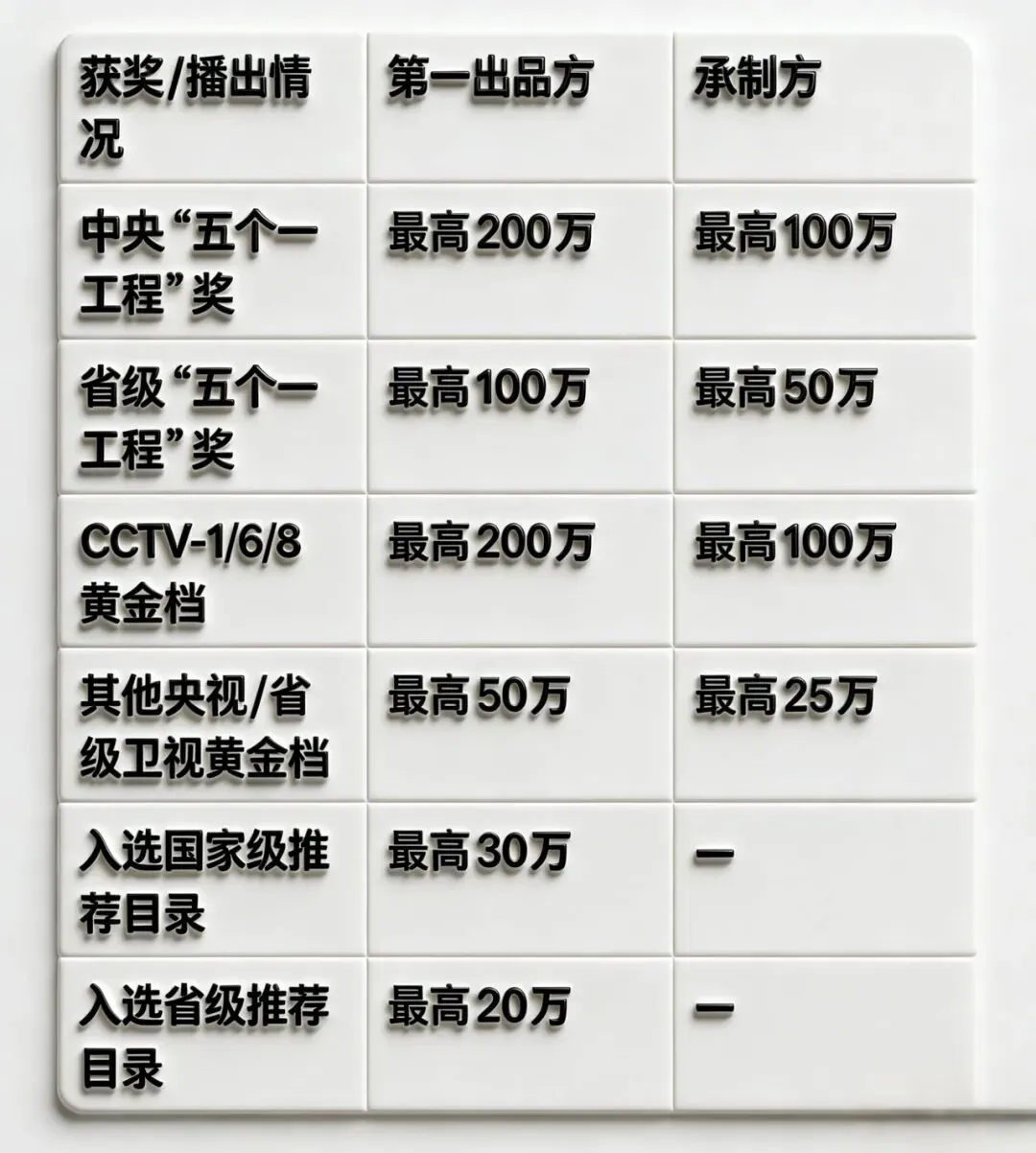 · 境外播出:播放量不低于1亿次,第一出品方最高100万元