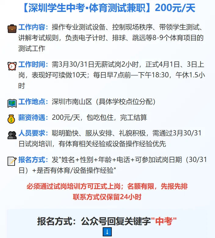 >【深圳兼职】深圳学生中考·体育测试兼职丨200元/天;负责电子计时、排球、跳远等8到9个项目的测试,操作设备、带领测试、讲解规则.