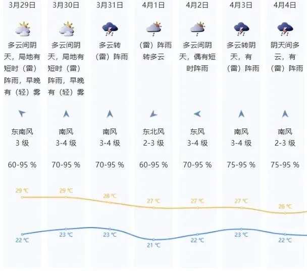 大致多云,早晚有(轻)雾,间中局地有短时(雷)阵雨,3月29日气温22~29℃。