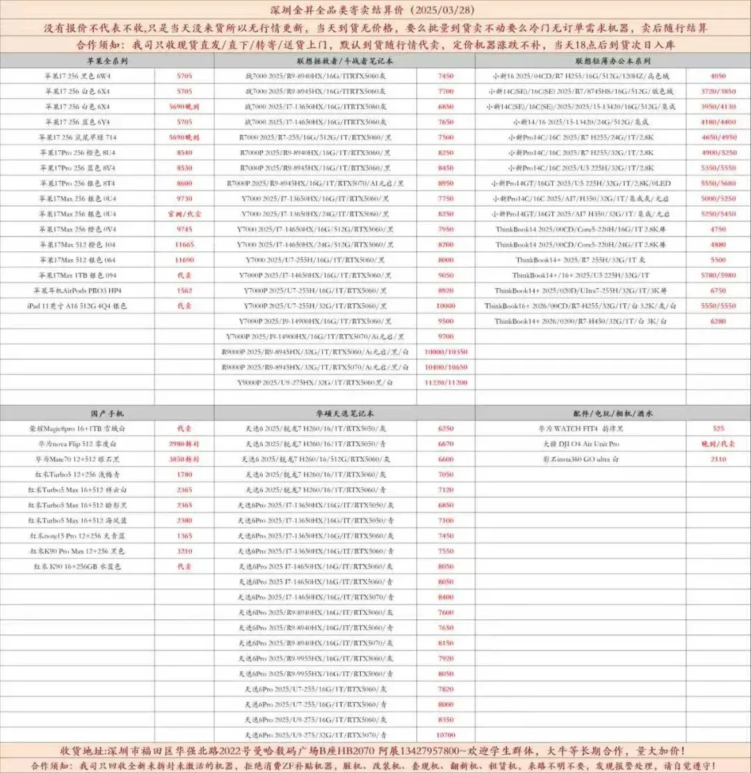 深圳金昇/笔记本/手机/电玩/回收结算价(2026/03/28)