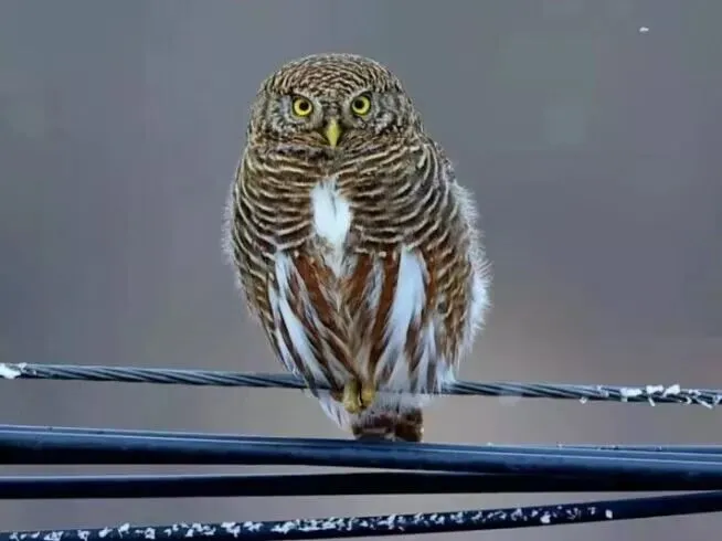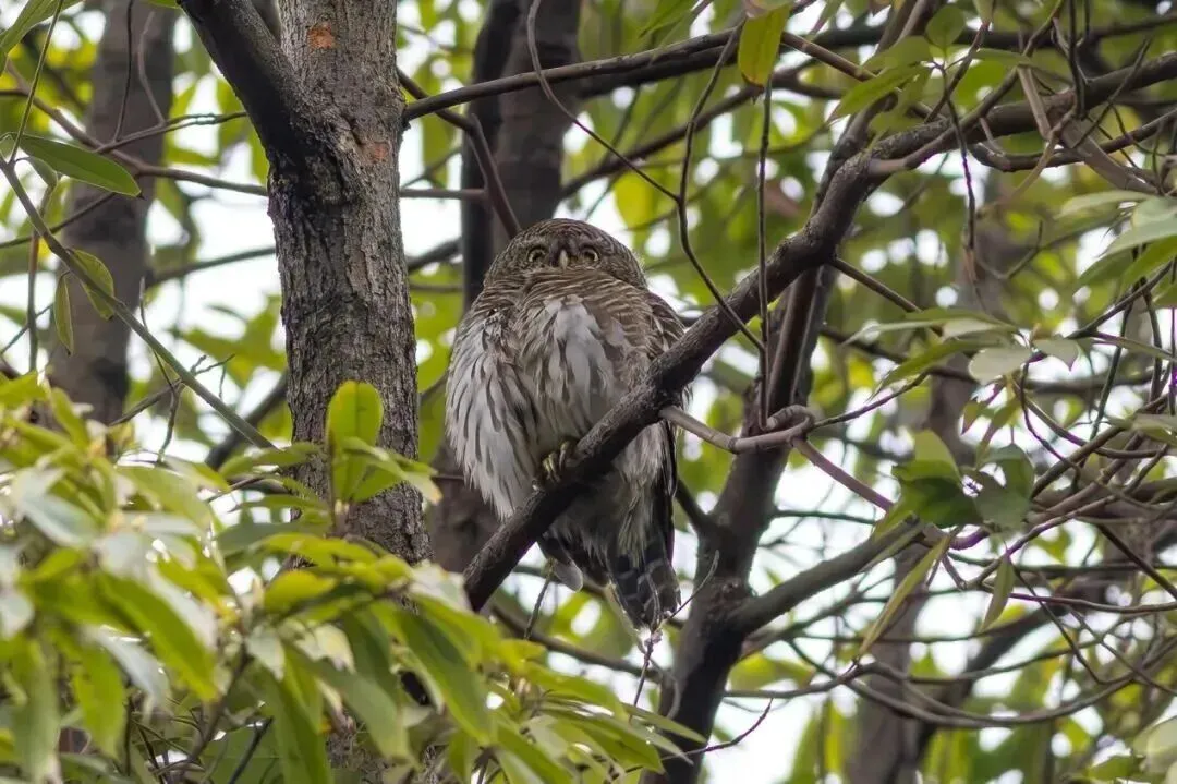 斑头鸺鹠:是鸮形目鸱鸮科鸺鹠属鸟类,体长24-26厘米,体重150-260克,头部无耳羽簇,全身布满棕褐色并具细的白色横纹,肩部具1道白色斜纹,喉部具白色颏纹,腹部白色具棕褐色纵纹,虹膜黄色,嘴黄绿色且端部黄色,脚黄绿色。