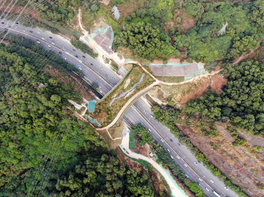 2024年初,鲲鹏径一号桥建成开放。这座全长约200米的生态廊桥,桥面覆土种植了梅林山和银湖山两地的原生植被,形成一条“空中绿带”。更巧妙的是,桥面一侧设置行人步道,另一侧完全保留为野生动物通道 。