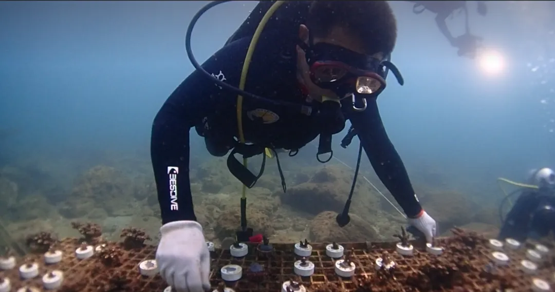 在大鹏湾,“海底森林”正在重生。大鹏湾海域国家级海洋牧场示范区,是全国首个以珊瑚保育为主题的国家级海洋牧场示范区。投放688个人工鱼礁礁体,推动种植10万株珊瑚,实现海底珊瑚育林。2019年以来,增殖放流鱼虾贝苗等经济物种超8000万尾,海洋生物资源持续增加。广东海洋大学深圳研究院团队在大鹏湾海底种植珊瑚。