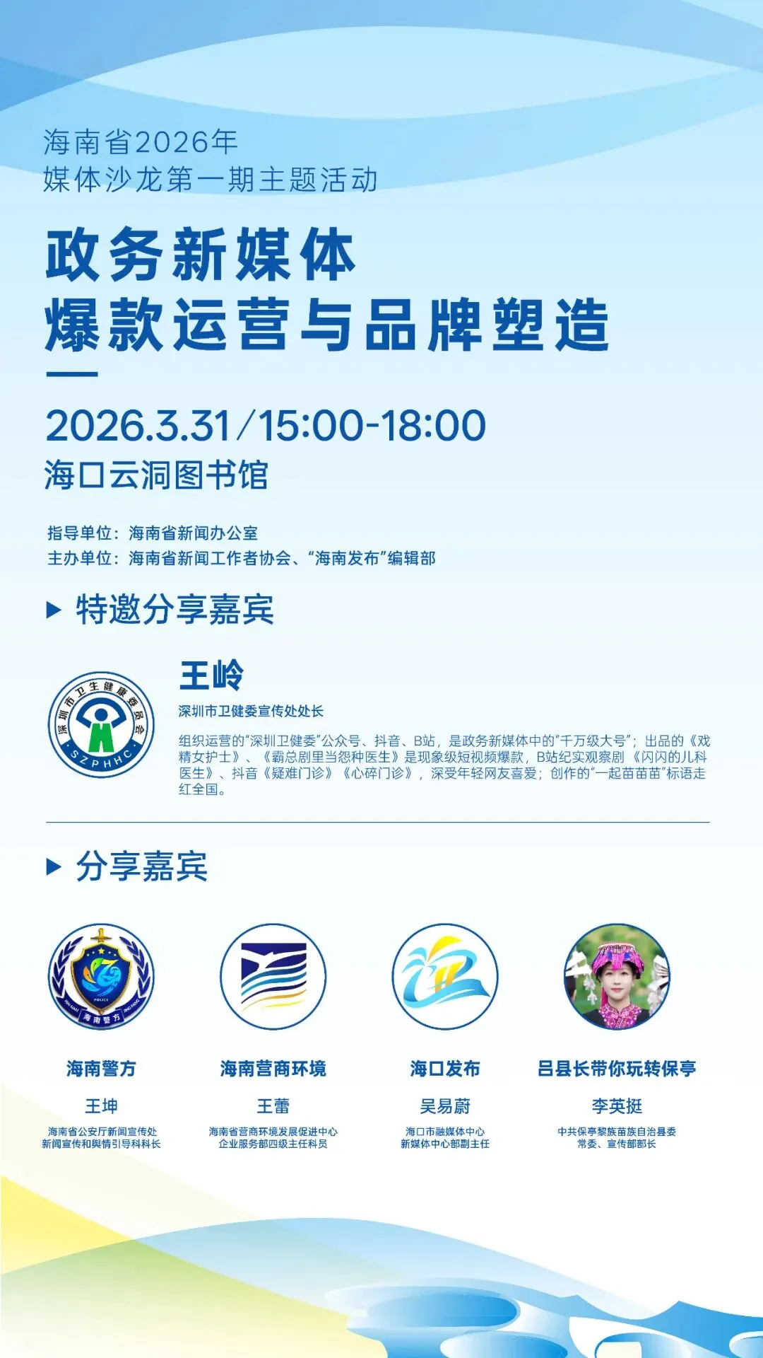 由海南省新闻办公室指导,海南省新闻工作者协会、“海南发布”编辑部主办的海南省2026年媒体沙龙第一期即将启幕,聚焦政务新媒体爆款运营与品牌塑造,更有10个线下粉丝名额免费送!