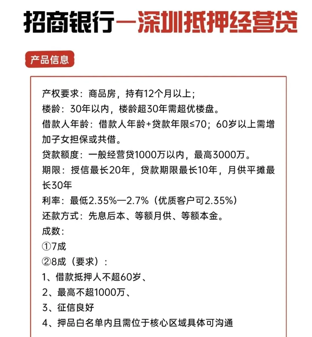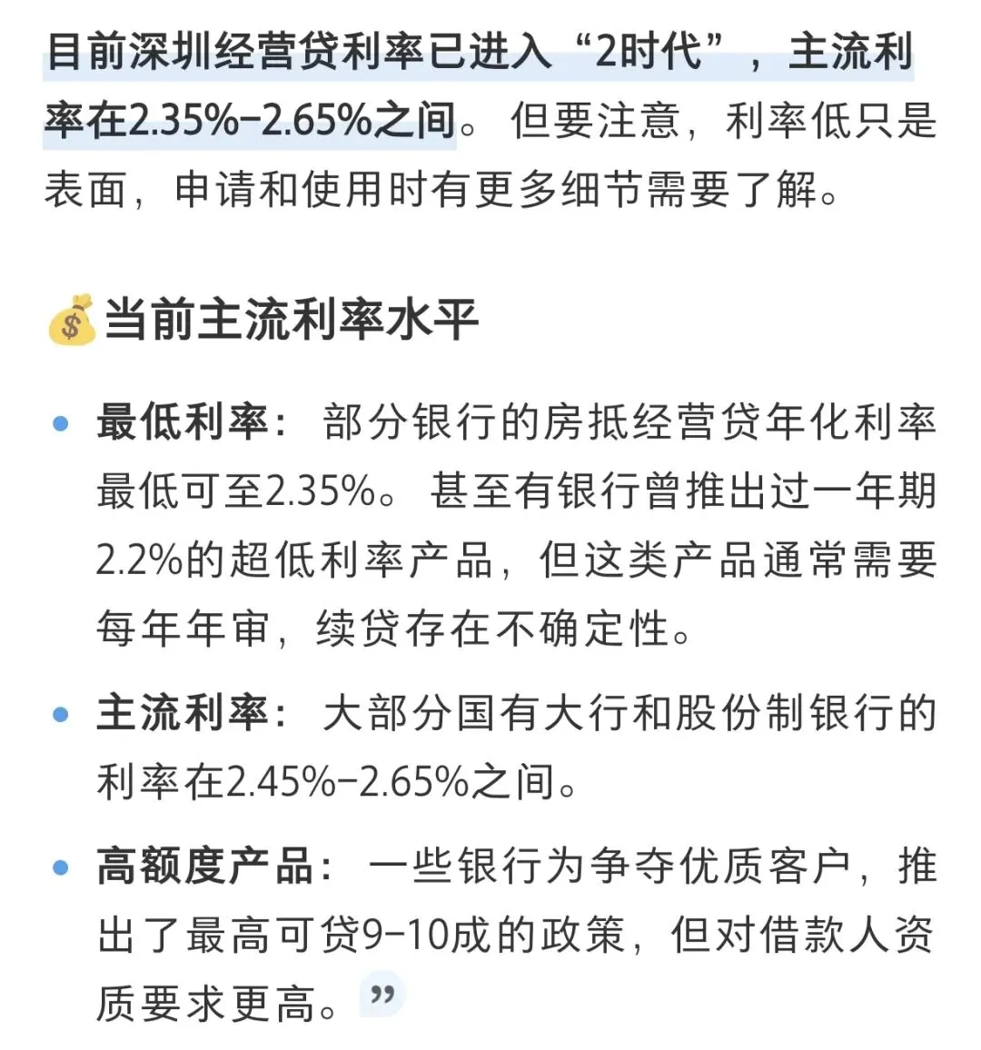 以上三家行目前是深圳经营贷市场占有率最高的银行。尽管也有很多商业银行利率比国有行低,但大部分还是会选择国有银行。很多银行利率广告确实都是区间,受客户资质影响,无论是信用贷还是抵押贷,最常见的字眼【低至.最低.起.】抵押贷款也一样,不同客户享受不的利率虽然很多商业银行广告是2.35年化,批出基本也和国有银行利率一样,因为标的都是区间利率。只有真正进件了,才知道是2.45.还是2.65,都是根据申批大模型大数据来给出实际利率,市场普遍标准年化利率在2.5%上下浮动。也是市场主流利率。目前市场最低利率为2.35%。个人经营贷最低利率已低于1年期LPR 65个基点,主要是银行为争夺优质客户及完成普惠小微贷款任务而让利。注意,2.35%也是有门槛的。以商业银行头部招商银行产品为例,商业银行产品大部分都参考国有银行:大家可以研究研究,招商是商业银行的代表:征信查询要求:贷款+信用卡审批审批3个月不能超6次,借款人不能担保.或有小额贷。小编以招行为例。产品要点是经营贷进件的基本门槛。各大行要求基本相同,具体根据客户的资质去匹配合适的银行。小编主要从事银行居间服务。熟悉银行审批规则。大家有去银行申请不下来的,或者额度不够的可以私聊小编。免费提供方案。