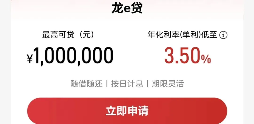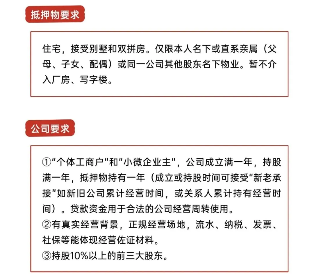 年化利率:2.45-2.65%,最高额度:3000万,要求公司成立满一年。对负债也有要求,负债不能太高,有明确还款来源。