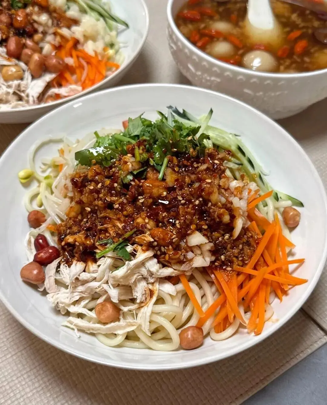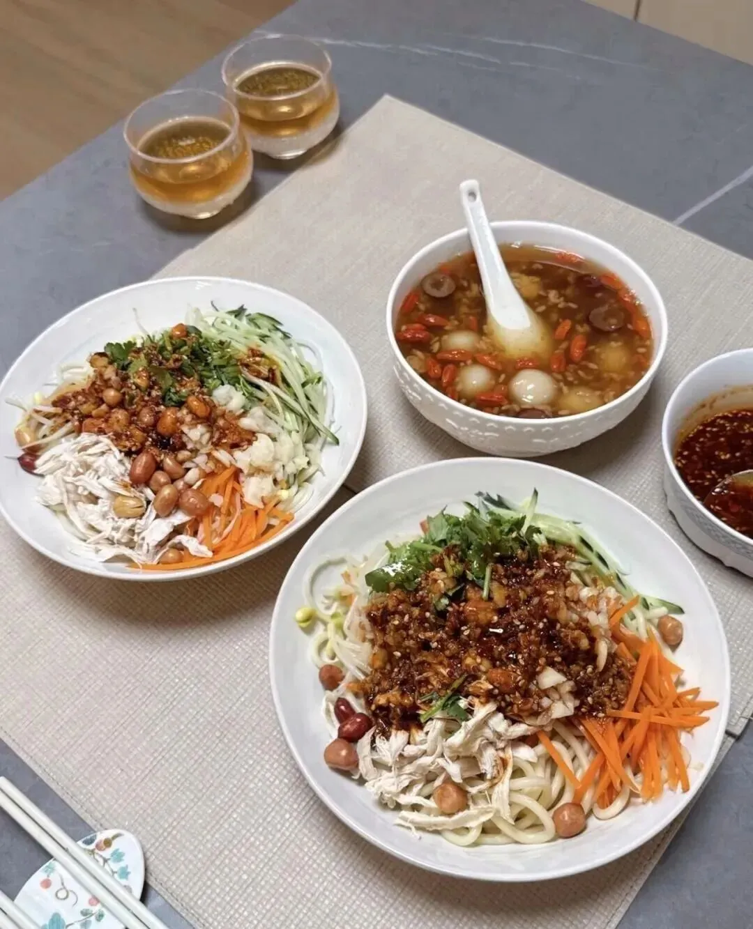 两碗鸡丝凉面,一大碗红糖醪糟汤圆,旁边还配了蘸汁和热茶。没有摆盘滤镜,也不是精致餐厅风,甚至乍一看,还有点“乱糟糟”的。红油是直接泼上去的,花生撒得随意,鸡丝撕得不算规整,黄瓜丝、胡萝卜丝、豆芽堆在面上,各有各的位置。