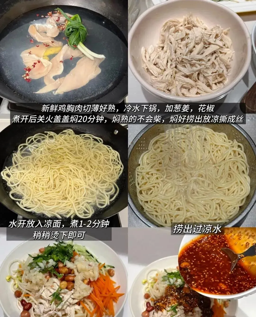 制作过程其实更能说明问题。鸡胸肉切薄,冷水下锅,放葱姜花椒,煮开后关火焖;面只烫一两分钟,马上过凉水;配菜切丝,酱汁现调。全都不难,但都费手。做饭的人愿不愿意在这种“不难但麻烦”的地方下功夫,差别非常大。