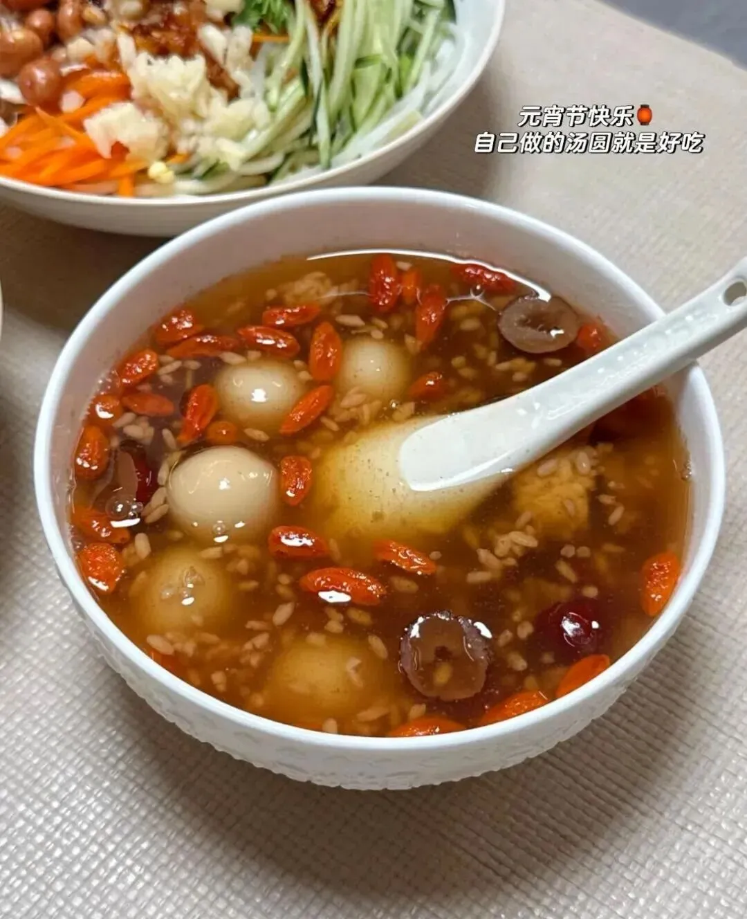 按理说,一顿凉面已经够了,可婆婆偏偏又煮了一碗红糖醪糟汤圆,里头有红枣、枸杞、酒酿,小汤圆圆滚滚地浮着,甜汤是温的、润的,正好把凉面的冲劲接住。一个负责开胃,一个负责收尾。嘴里辣过以后,再喝口甜汤,整个人都顺下来。