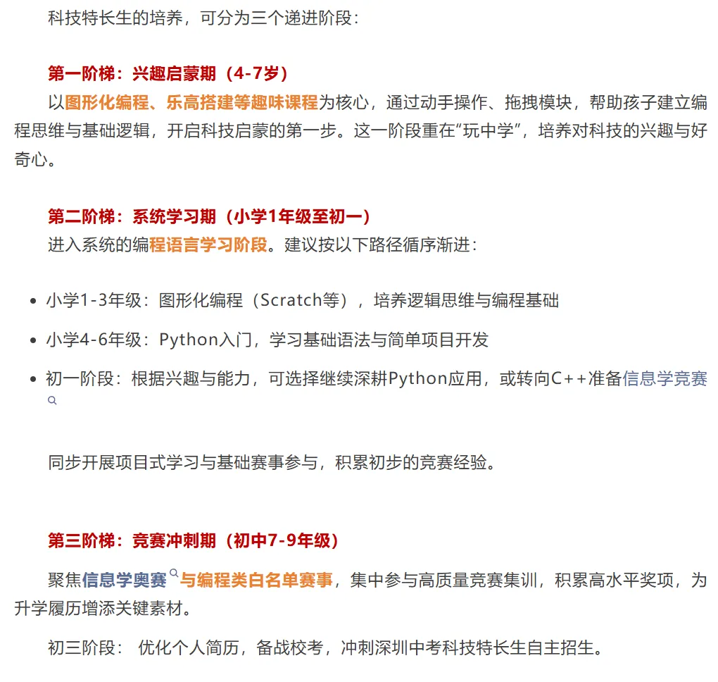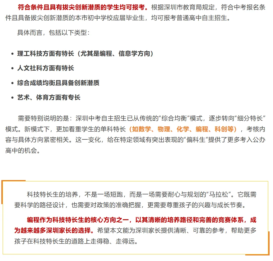 近年来,深圳中考科技特长生自主招生政策持续优化,越来越多的家长开始关注这条“科技升学”路径。然而,面对纷繁复杂的课程体系、赛事种类与升学政策,许多家长仍有诸多困惑。