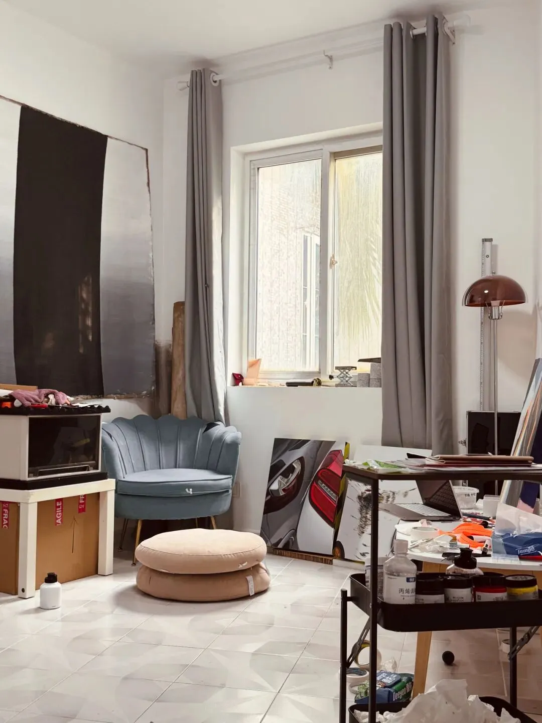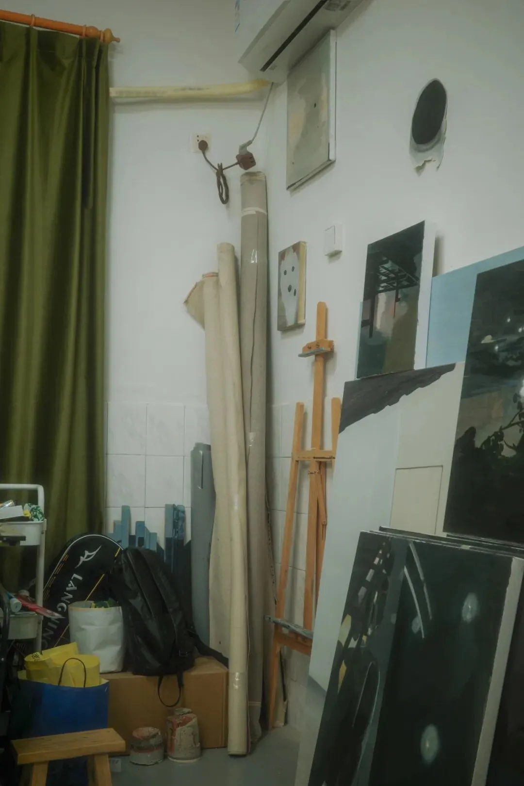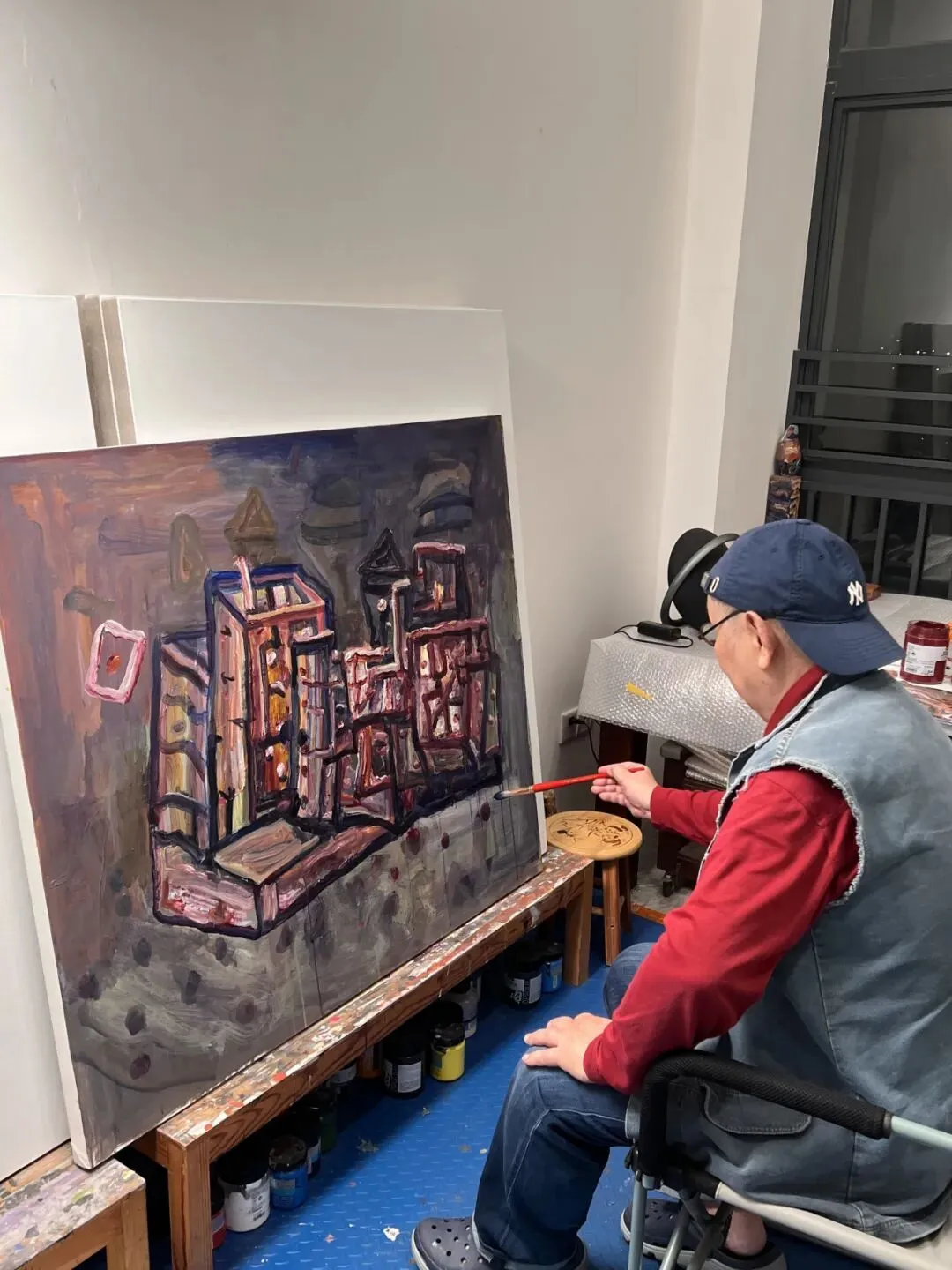 因为长期候鸟式地往返中国和加拿大以及在不同的城市居留,在2026年之前我很少有固定的工作场所。大多数作品完成于客厅,楼道,小区内庭,地下停车场或者展览现场。今年在华侨城租了一个两室,便将客厅的一部分和一间房间作为工作室集中创作需要等颜料干透或者产生粉尘的作品。生活的气息和创作的素材在这里等量齐观。