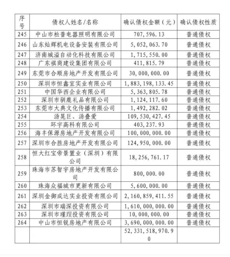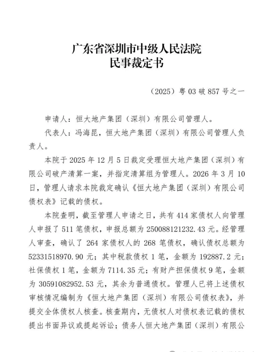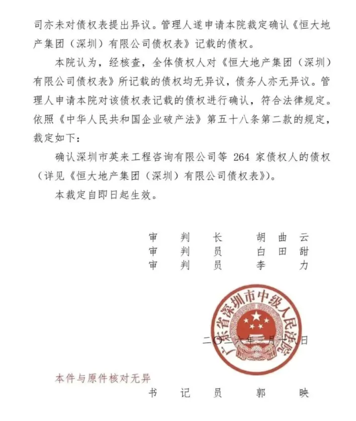 深圳中院裁定如下:确认深圳市英来工程咨询有限公司等264家债权人的债权(详见《恒大地产集团(深圳)有限公司债权表》)。