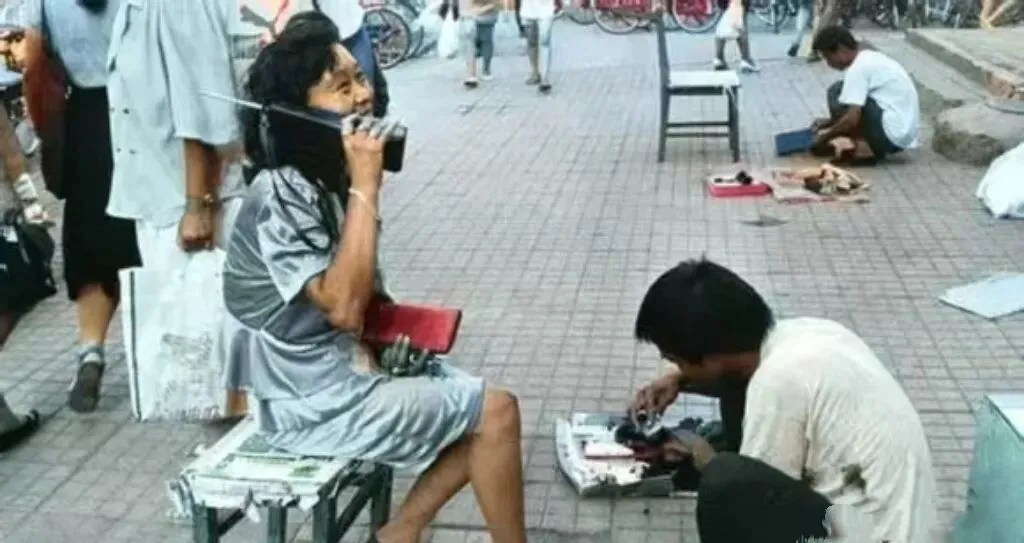 这张里头,穿着一身亮面连衣裙的女同志,手上抓着个大家伙,大哥大,“那年头有个这个,绝对是富贵人”,电话壳子厚得能当板砖使,天线伸得老长,打一次电话能把旁人都看沉默了,腿边还蹲着擦皮鞋的,细细地擦,鞋面都要反光,路边人来人往,这种场面往前推几年怕是想都不敢想,现在满大街人手一部小手机,那时候别说,能在街头拎着“大哥大”打电话的,可真是稀罕人种。