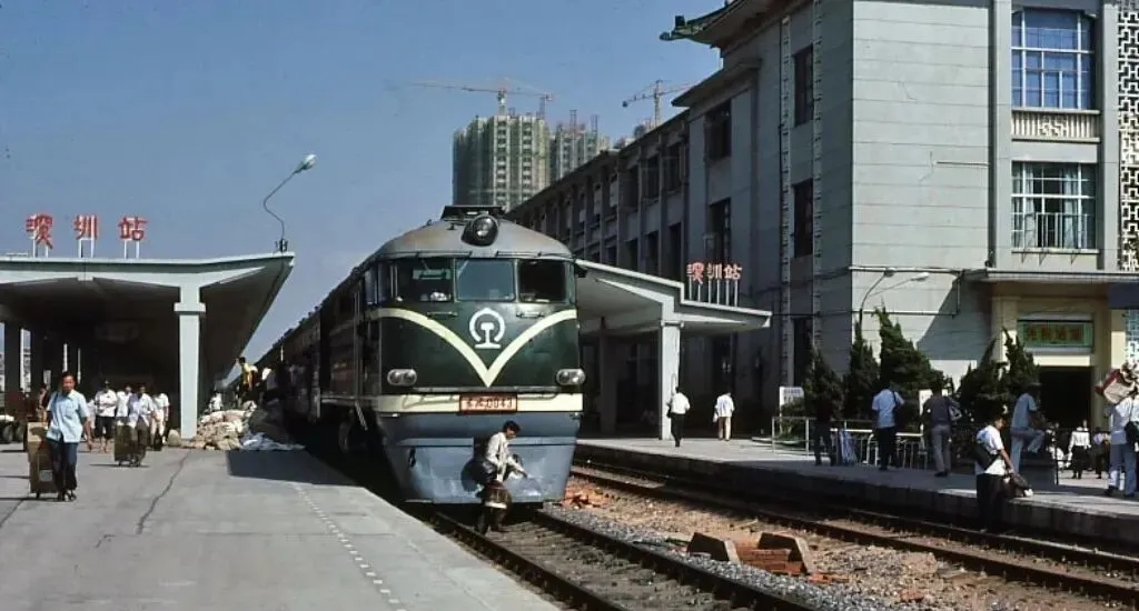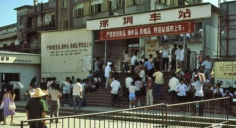 这火车头一停,车站边上全是拖箱提包的,门口竖着深圳站三字,房子不高,白墙黑框小窗格,铁轨边的砖头一摞一摞,小孩扯大人的衣角问,“咱从这能一直坐到广州么”,看着远处高楼顶上还立着脚手架,那份热闹和盼头,现在让人一眼就认出是八十年代的影子。