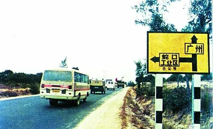 这路牌,有点意思,粗粗一块板,黑字黄底,“蛇口工业区”、“广州”,指哪走就哪分岔,那会儿高速公路还没影,车跑得慢,尘土扑腾,八公里的标记看起来像远行,其实一转头就到了尽头,现在导航一按,语音直说,四十年前还得靠路牌认方向,司机师傅也记得牢,问他路线准没错。