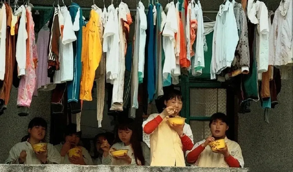 楼上一排晾衣竿,裤衩衬衣挤一溜,底下几位女工端着大碗蹲阳台,天太热,屋里闷得慌,厨房只有小风扇,要么干脆去阳台边吹风边扒饭,筷子咔咔响,碗里简单一撮青菜咸蛋汤,那笑脸现在看都透着一层汗水和实在,厂房宿舍不宽敞,但朋友凑一起一样有热闹日子。