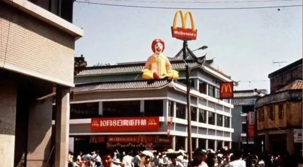 再一张拉近点,楼顶还坐着个小丑公仔,下面那条红横幅写着“10月8日隆重开业”,真的是全民热闹大事件,游人路过都要抬头望一眼,被挤得水泄不通,有人背着小孩凑热闹,有人撸起袖子准备冲进去买杯可乐,那会儿深圳就是这样,什么新鲜事都敢第一个试水,想“吃洋快餐”不出国门,在这里头一遭就成传奇了。
