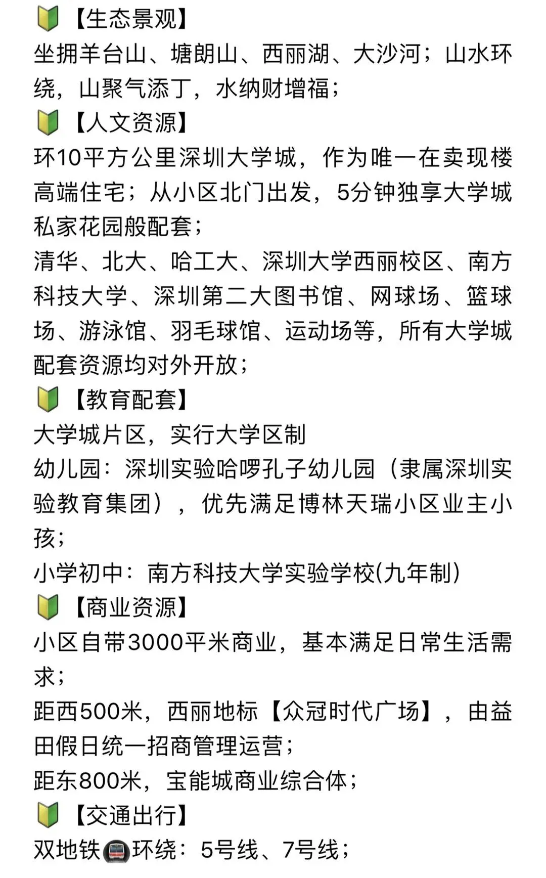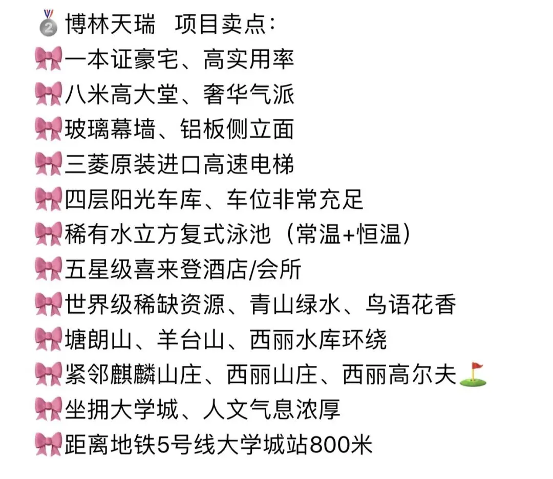 博林天瑞占位西丽湖国际科教城核心,这里是大湾区 “硅谷基地”,汇聚清华、北大、哈工大、南科大等 18 所顶尖学府,形成 “高等教育 + 科研 + 产业” 的创新生态链,人文与科创氛围浓厚。项目傲踞平山二路与留仙大道黄金十字轴,150 米地标建筑俯瞰全城,360° 环抱千万级生态资源:1000 万㎡塘朗山原生山脉、4000 万 m³ 西丽湖、130 万㎡高尔夫绿地,城央鲜氧环绕。片区永久性生态绿地与学校用地占比超 60%,住宅供应仅 8%,生态稀缺性凸显。深圳博林天瑞售楼处电话✆✆:400-856-3771楼盘开盘、交房时间、房价、户型、学区、怎么样、楼盘详情、价格、售楼处地址、销售中心电话、楼盘地址、户型图、交通、备案价、最新优惠、营销中心电话、得房率、周边配套等详情咨询【免责声明】:本信息来源开发商推广资料和网络收集,更多为传递正能量,本文所述内容和意见仅供参考,如有侵权,请联系我们,我们将进行整改或删除!谢谢!