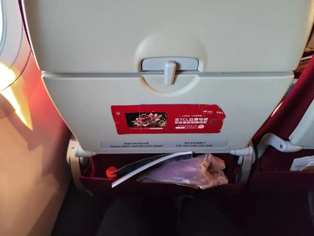 本次行程就坐于经济舱第一排左侧靠窗座位 6A。深航部分窄体机型的前三排实际上为舒适经济舱,因此普通经济舱的第一排在整体客舱布局中对应的是第四排。作为深航常旅客,入座后注意到座椅前方口袋内已提前放置好毛毯与瓶装水,这一点细节安排颇为贴心。