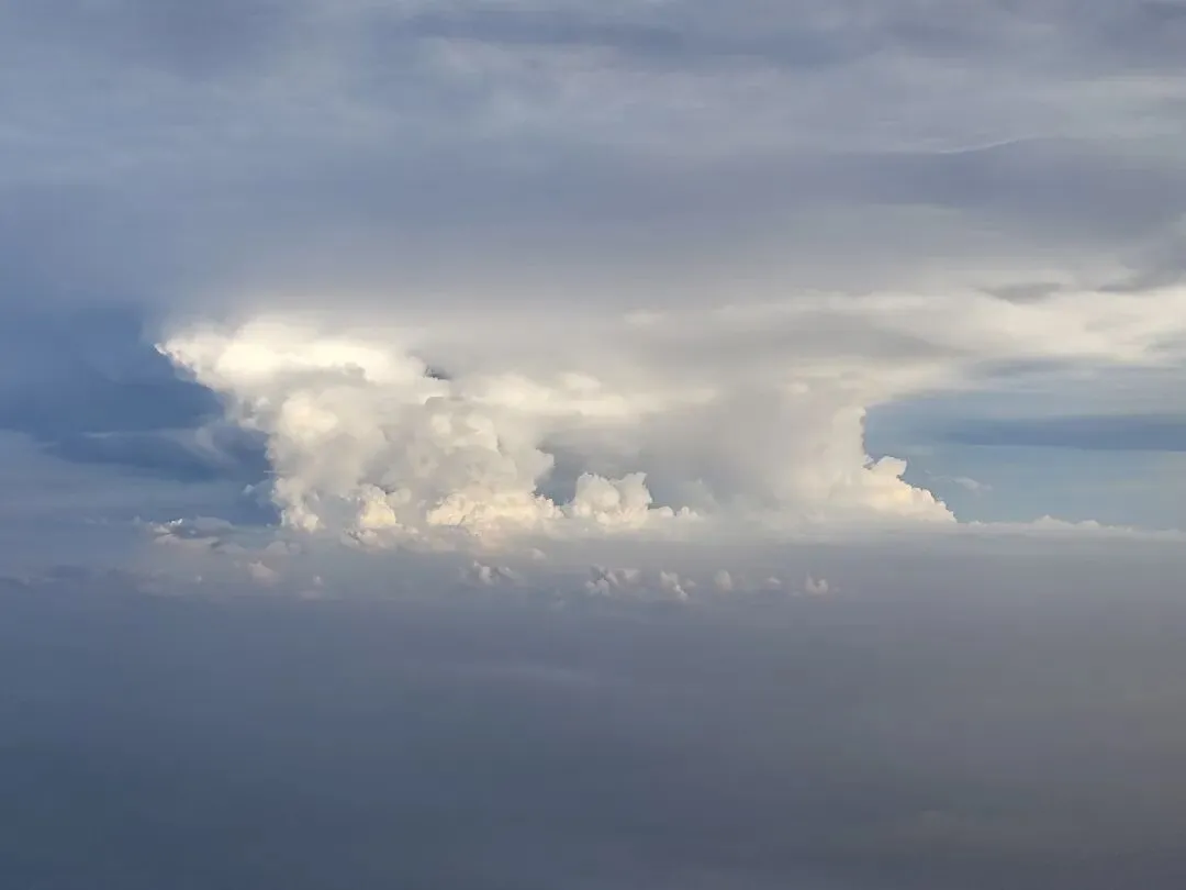 飞行时间正值傍晚,平飞阶段窗外可见晚霞中的云彩,