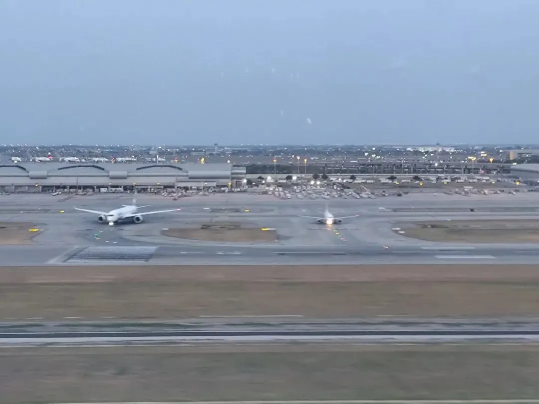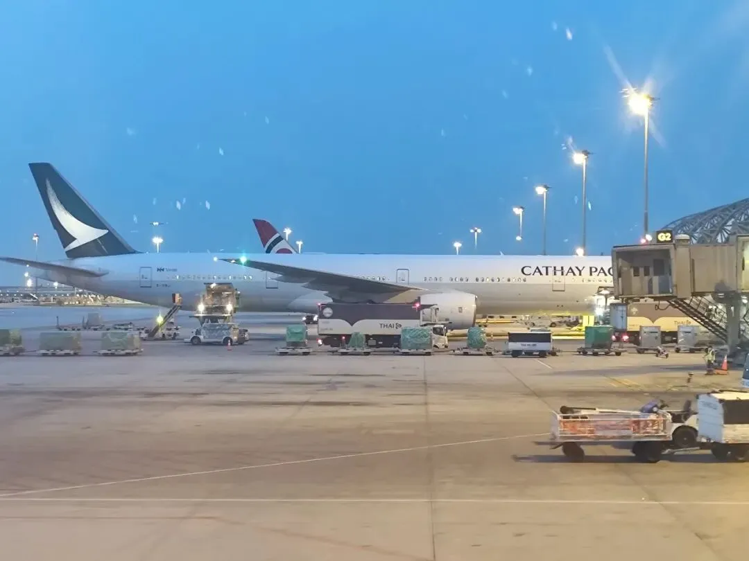 当地时间下午6:31分降落在曼谷素万纳普机场20R跑道,实际飞行两个半小时降落使用的20R跑道是素万纳普机场航站楼西侧新建的第二跑道,印象中10多年前飞曼谷时还未铺设该跑道。从20R滑行至航站楼需穿越20L跑道。也正是在穿越20L时抓拍到该照片。飞机滑行至停机位。此时停靠在一旁的是一架国泰航空的 777‑300,从发动机上的RR logo可以看出,这是较为少见的非 ER 版本的 777-300 机型。这类机型如今在全球范围内数量已经不多,相比之下,更常见的还是 777‑300ER ,其统一采用 GE90 发动机。