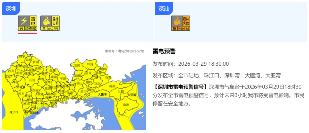 【深圳市雷电预警信号】深圳市气象台于2026年03月29日18时30分发布全市雷电预警信号,预计未来3小时我市将受雷电影响。市民停留在安全地方。