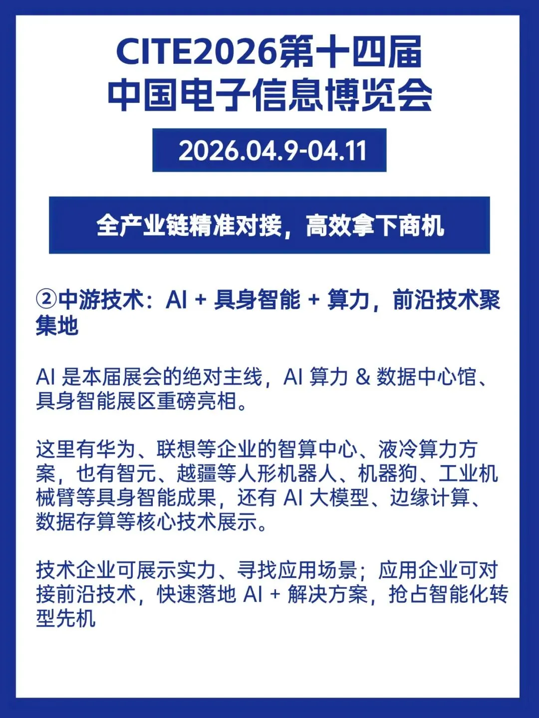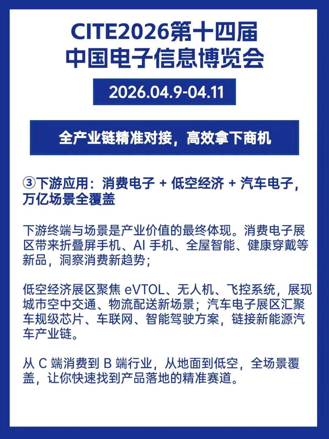 而 CITE2026 恰好精准解决这些痛点 ——8 万㎡展示面积、超 1200 家全球领军展商、6 万 + 专业观众(采购决策占比超 68%)、5000 + 首发新品、50 + 场专业论坛,从上游元器件到下游终端应用,从 AI 算力到低空经济,全产业链覆盖,让你一次逛展,搞定趋势、资源、商机三大核心需求。