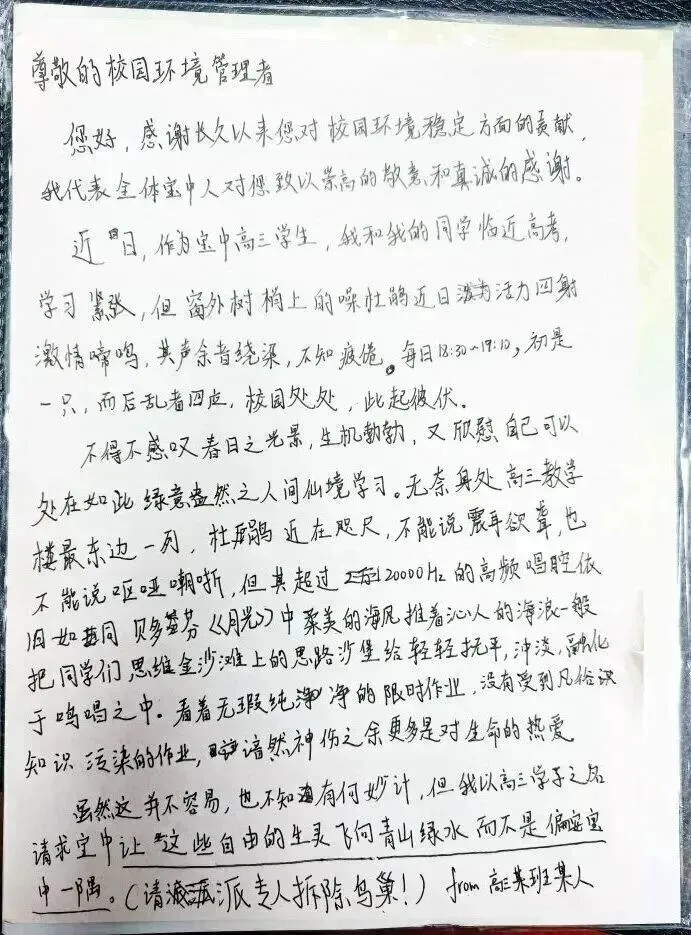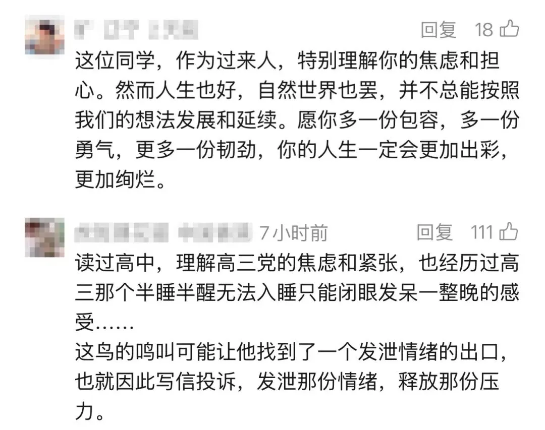 就在网上争论“育分”和“育人”哪个更重要的同时,自始至终让大家欣慰的是,那个匿名写求助信的高三学生,并非个别网友口中“娇气”“自私”的少年,信中字里行间没有戾气,只有备考的焦灼与内心的柔软:他吐槽鸟鸣“一遍遍冲淡解题思路”,却也由衷赞叹校园的生机;他半调侃半恳切地请求拆巢,却也藏着对自然生命的不舍。而面对质疑,他勇敢地站出来,以视频进行回应。视频中,他始终微笑着,“感谢网友的耐心回复和校长的悉心教导,也让我对生命和自然有了新的思考”,并不忘为2026届高考考生加油,同时祈愿“我们都能与世界温柔共处。”