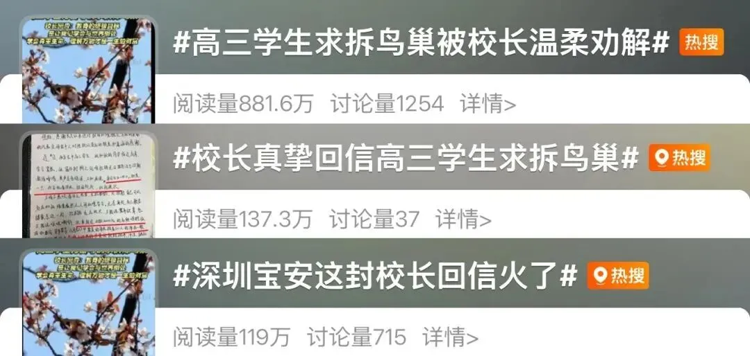 公开信发布后,APP、微信公众号和纸媒“打头阵”,市内外视频号和自媒体“前赴后继”。短短几天时间后,各种形式的报道已经铺天盖地,由校长婉拒拆鸟巢请求引发的“生命教育”,成为网友盛赞的主升浪。